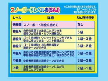 レッスン班構成のため、お申込み時には、必ず上記表を参考にお子様のスキーもしくはスノーボードレベルをご入力ください。