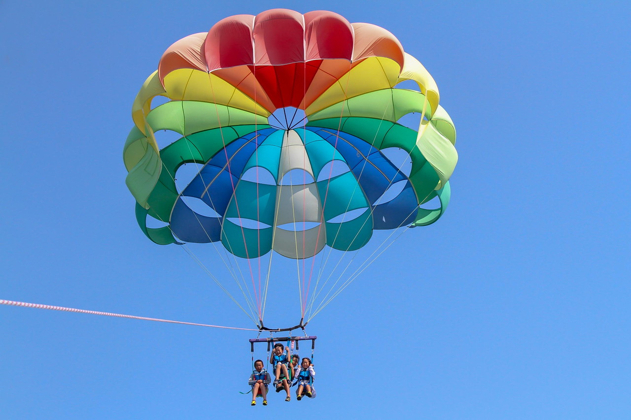 パラシュートをボートで引っ張ってもらい、空中散歩に出発★青空広がる空中へ行けば、足元に広がるエメラルドグリーンの海を眺めることができるよ!爽快な風を感じながら、空の旅を楽しもう♪