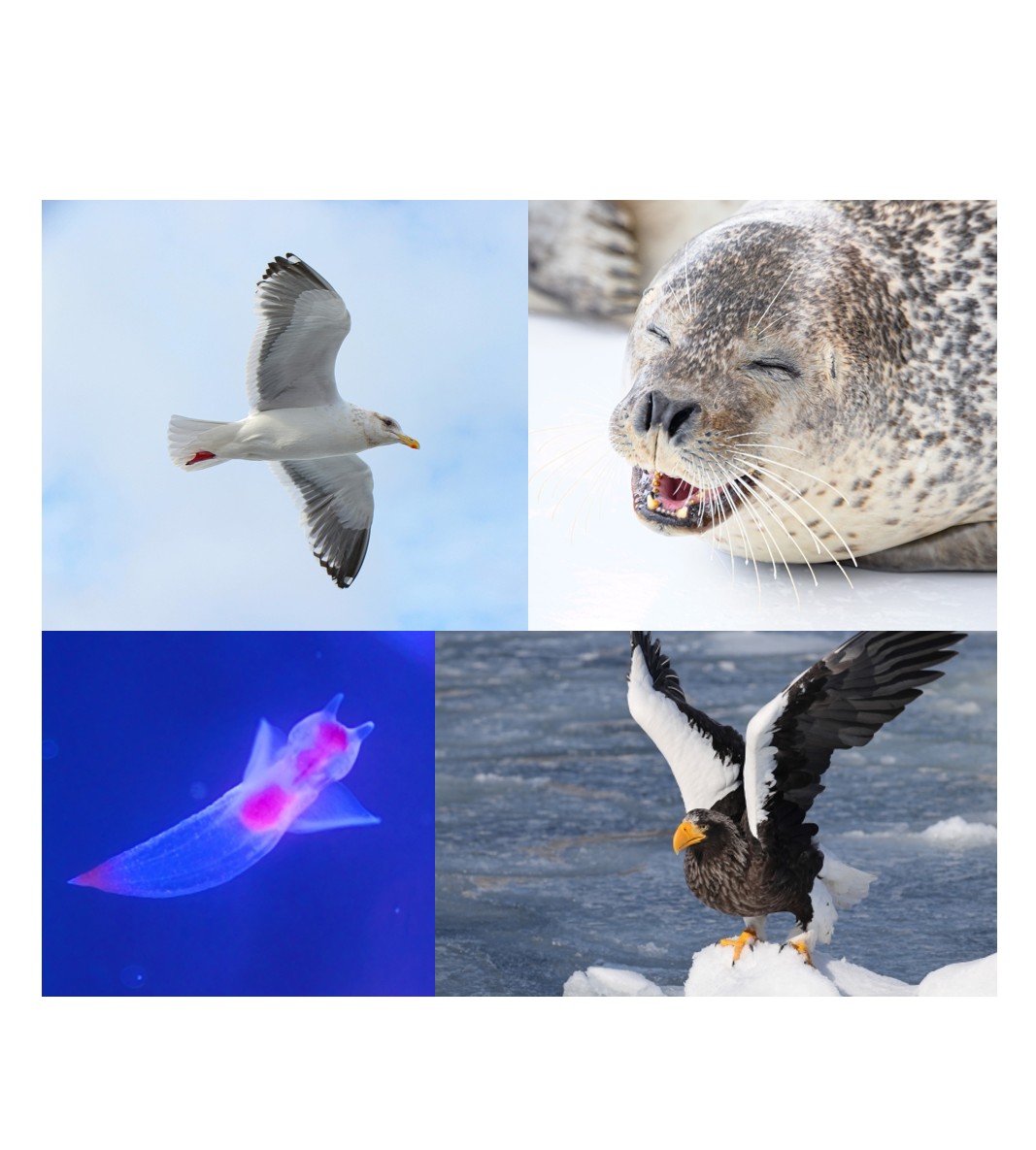 流氷の世界にはさまざまな生き物が暮らしています★運が良ければアザラシやオオワシなどの野生生物にも出会えるかも!?オホーツクタワーでは“流氷の天使クリオネ”にも会いに行こう♪ -