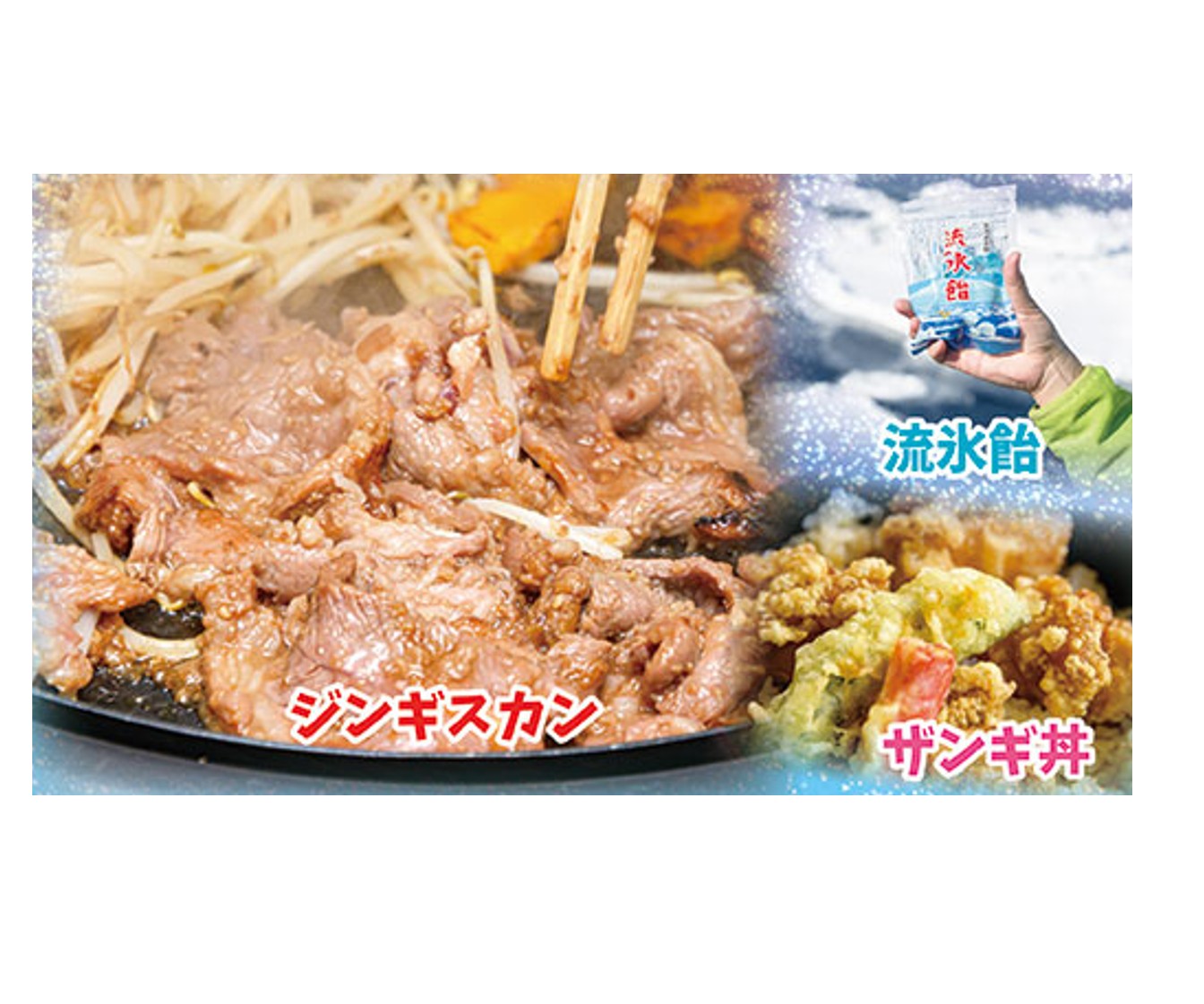 宿特製のジンギスカンやザンギ丼など北海道グルメも大満喫!!おーろら号の上で流氷を見ながら食べる流氷飴は甘くておいしいよ◇北海道ならではの味を楽しもう♪ -