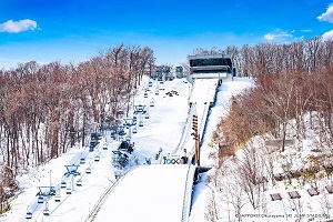 急斜面に大興奮間違いなし!!スキージャンプ台の頂上へリフトに乗って向かいます♪選手になったような気分を味わえるよ☆標高307mから眺める大パノラマと、ジャンプスタート地点の急勾配を体感しよう☆ -