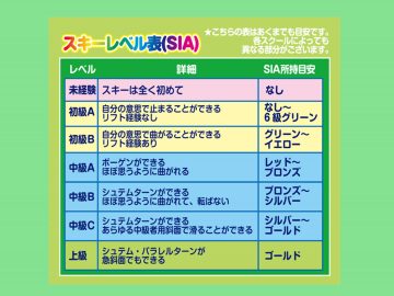 - 『公益社団法人日本プロスキー教師協会(SIA)』の検定を受けます。タイム計測ではなく、技術を見て公平に合否が判断されます。全世界共通の検定項目を受けることができるため、SIAのバッジを持っていることは世界でのスキーレベル証明に繋がります。宿泊のスキー&スノーボードキャンプは全員受検としており、目標をもってレッスンを行うことと、自分のレベルを知るために設定しております。