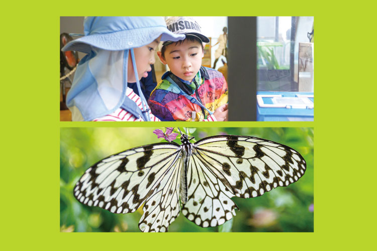 世界中の昆虫が展示された“昆虫観察館”を見学!日本最大級の蝶「オオゴマダラ」は必見です★亜熱帯の植物が生い茂る館内を、オリジナル昆虫シートを持って回るよ◎何種類の生き物を見つけることができるかな? -