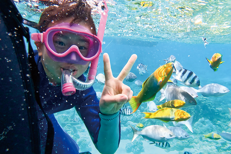 - 海に入る際は、必ずウェットスーツを着用します。また、シュノーケルレッスンで水に慣れる時間も設けてあります。