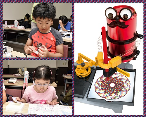 空きカンボディーのロボットが体を前後に揺らしながら、回転するトレイ上の紙になめらかな曲線で模様を描きます。ペンを取り付けるアームの長さや場所を変えると描く模様も変わるよ☆ペンの色を変えたりしてオリジナル曲線アートを作ろう!