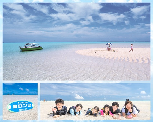 大金久海岸の沖合に潮の満ち引きによって限られた時間にだけ出現する幻の砂浜「百合ヶ浜」。出現する砂紋の美しい真っ白な砂浜は、360°ヨロンブルーの透明度の高い海に囲まれ、絶景が広がります。まさに天国!ここで星砂を集めて、ボトルに入れて持ち帰ろう♪ -