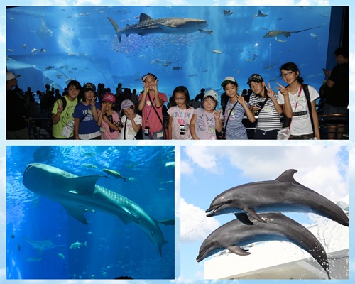 美ら海水族館…ジンベエザメやナンヨウマンタなど、多くの生き物が泳ぐ大水槽は迫力満点!沖縄の海の世界を覗きにいこう☆オキちゃん劇場での、ダイナミックなイルカショーもお楽しみに!