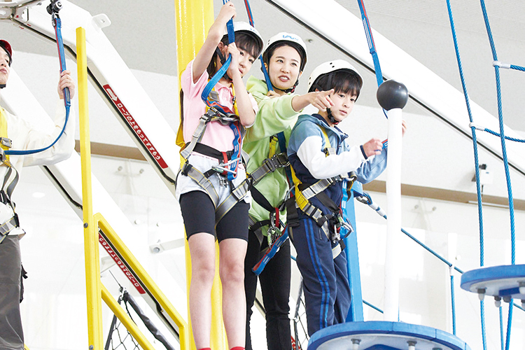 国内で屋内初導入のロープウォークエリアに挑戦!ハーネスをつけて[高さ3.5m、全長111.63m]のスリルを味わおう♪最後には18mの距離を一気に滑り降りるジップラインが!? -