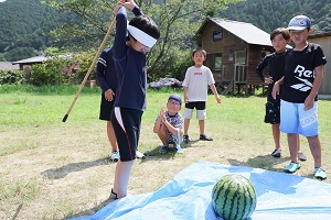 夏の風物詩である“スイカ割り”にも挑戦★お友達の声をたよりに進んで…さぁ上手に割ることができるかな?目隠しをして、棒を持ち、ぐるぐる回ったらスタート!