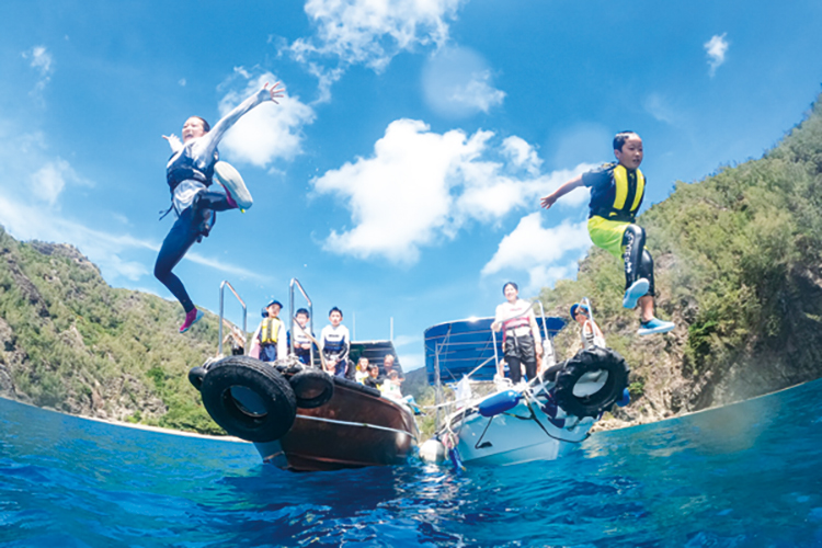 そらまめキッズの貸切ボートではなんと“飛び込み”に挑戦◎船の上からジャンプしてみよう♪爽快感抜群です!!飛び込んだ先の海には美しい世界が広がります♪