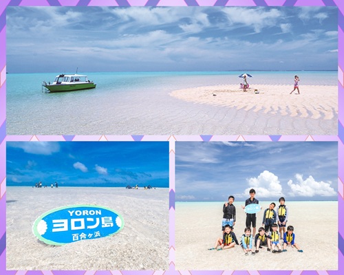大金久海岸の沖合に潮の満ち引きによって限られた時間にだけ出現する幻の砂浜「百合ヶ浜」。出現する砂紋の美しい真っ白な砂浜は、360°ヨロンブルーの透明度の高い海に囲まれ、絶景が広がります。まさに天国!ここで星砂を集めて、ボトルに入れて持ち帰ろう♪ -