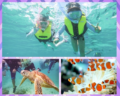 | プログラム | ●百合ヶ浜上陸 ●ウミガメシュノーケリング ●沖縄本島ホテルプール ●美ら海水族館 ●沖縄グルメバイキング ●リゾートホテル満喫 ●メモリーバッグ作り ●シーサー作り体験 ●お土産タイム 等 |