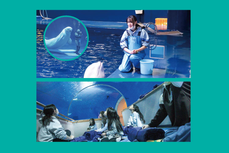 シロイルカの飼育に力を入れている“島根県立しまね海洋館アクアス”へ出発!夜の貸切水族館を満喫するよ♪特別に巨大水槽前でお泊りします★飼育員さんの解説を聞きながらバックヤードを見学! -