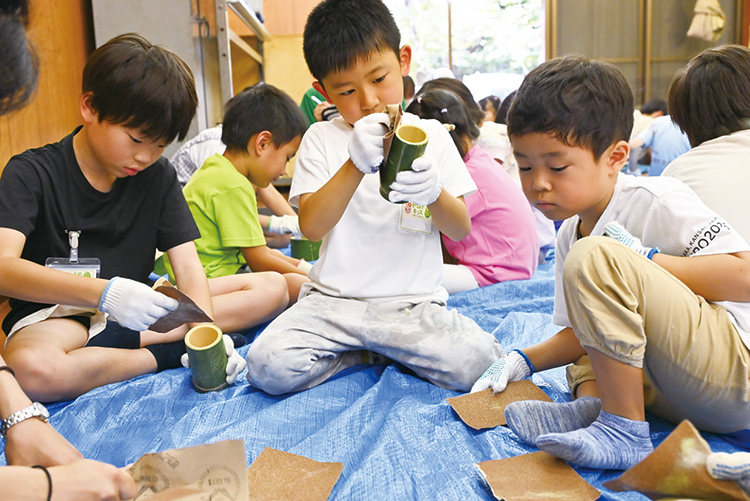 1人1つ、竹コップや竹水鉄砲を作ってみよう☆