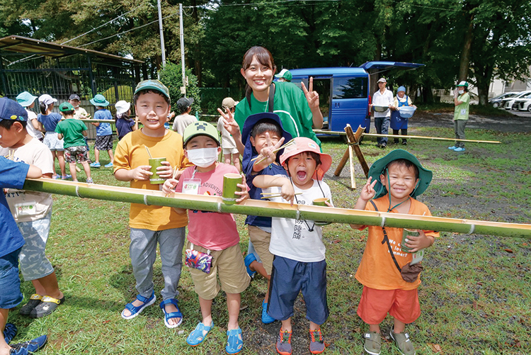 夏の風物詩“流しそうめん”にもチャレンジ♪竹のレーンを流れるそうめんをキャッチして、おいしいつゆにつけていただきます★上手にキャッチできるかな?自分で作った竹コップで食べるそうめんの味は格別です◎ -