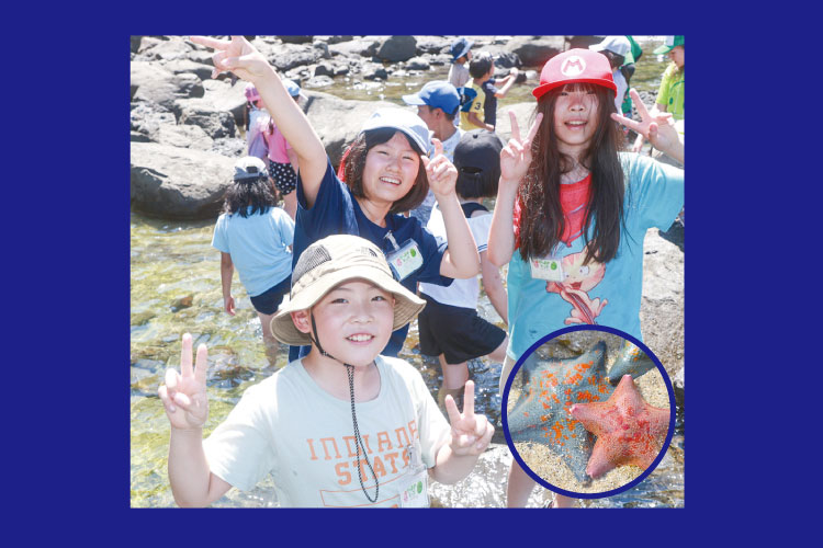 釣り場近くの岩場で、海の生き物探しをするよ☆岩の隙間や海藻の下など隠れていそうな場所を探そう!小魚やヒトデなど何種類の生き物を見つけられるかな?砂浜では海岸の漂着物を拾ったり観察したりしよう♪ -