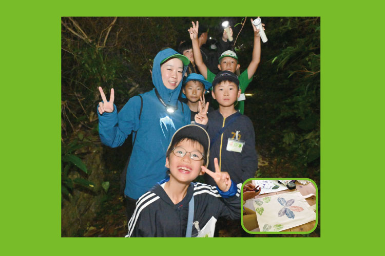 夜にはガイドの解説付きナイトハイクへ!山で市街地の明かりがさえぎられているので満天の星空が楽しめます◎ネイチャーかばん作りでは好きな形の葉っぱに色のインクをつけて世界に1つのかばんを完成させよう♪
